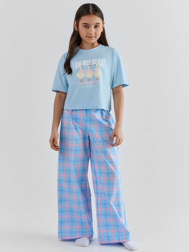 Домашняя пижама для девочек в нежном голубом цвете с надписью «Я ещё не готова ко сну» — с юмором обыгрывает вечерние сборы и поднимает настроение перед сном. Состоит из свободной футболки и удобных брюк — идеальный вариант для уютных вечеров и спокойного отдыха.