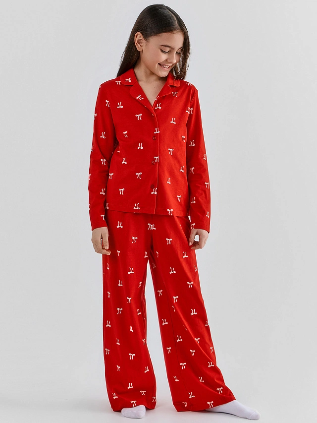 Красная пижама для девочек с принтом — праздничный комплект для комфортного сна. Набор состоит из рубашки прямого кроя и брюк, выполненных из натурального хлопка.