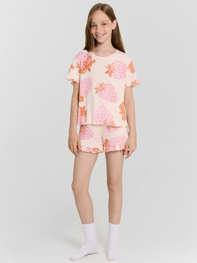 Домашний комплект для девочек — уютный и стильный выбор для комфортного отдыха и сна. Футболка прямого силуэта с круглой горловиной обеспечивает удобную посадку и свободу движений, а ее лаконичный крой делает модель универсальной. Шорты прямого силуэта с эластичной талией мягко прилегают к фигуре, обеспечивая комфорт в течение всего дня. А нежная рюша по нижнему краю добавляет очаровательный акцент, делая комплект более изящным. Выполненный из натурального хлопка, комплект приятен к коже, воздухопроницаем и обеспечивает уютные ощущения. Прекрасный вариант для домашнего гардероба, сочетающий удобство, стиль и нежные детали!