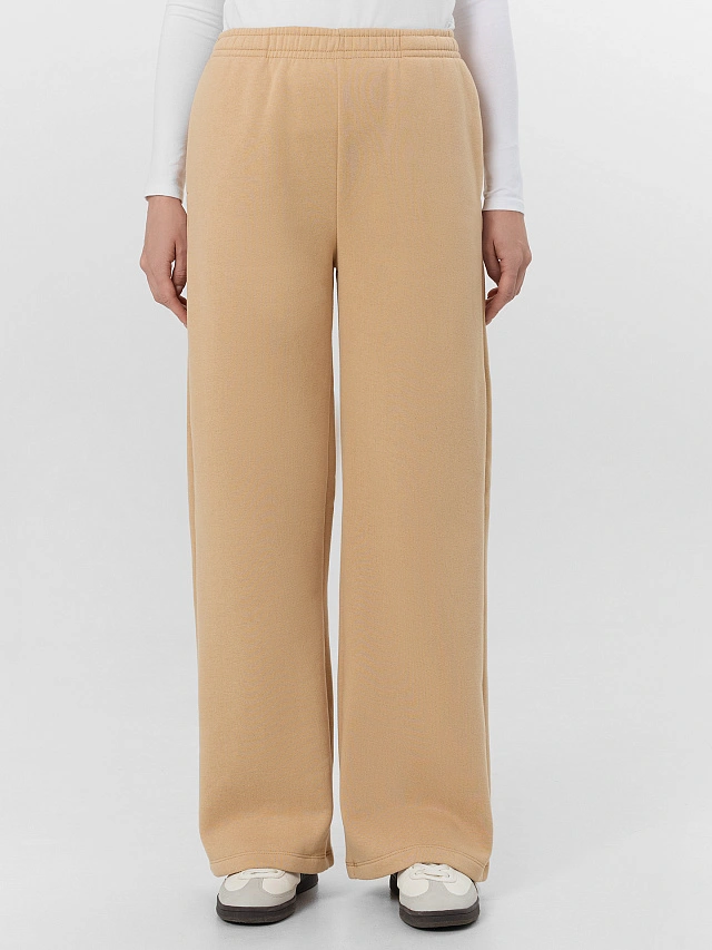 Бежевые брюки для девочек прямого кроя с мягким начесом — уютная и практичная модель для повседневной носки. Удобный пояс с широкой эластичной тесьмой обеспечивает комфортную посадку, а две аккуратные отделочные строчки добавляют модели изящности.