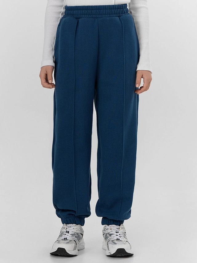 Синие брюки для девочек свободного кроя с мягким начесом — практичная и уютная модель для повседневной носки. Элегантные стрелки на передних деталях добавляют образу аккуратности и строгости. Широкий пояс с эластичной тесьмой обеспечивает комфортную посадку, а декоративная строчка подчеркивает продуманный дизайн.