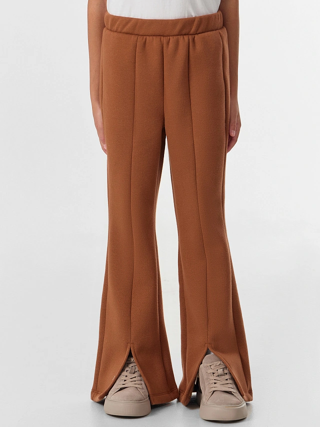 Фасон плавно расширяется книзу, создавая элегантную расклешенную линию. Особый шарм брюкам придают декоративный шов по центру и аккуратные разрезы внизу — эти детали делают модель непохожей на другие.