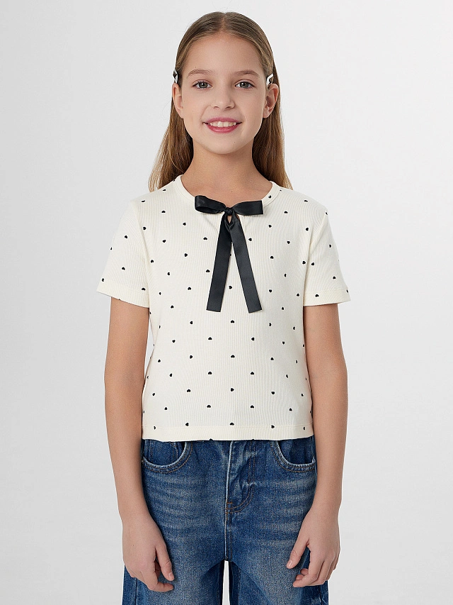 Футболка для девочек бежевая с декоративным бантиком