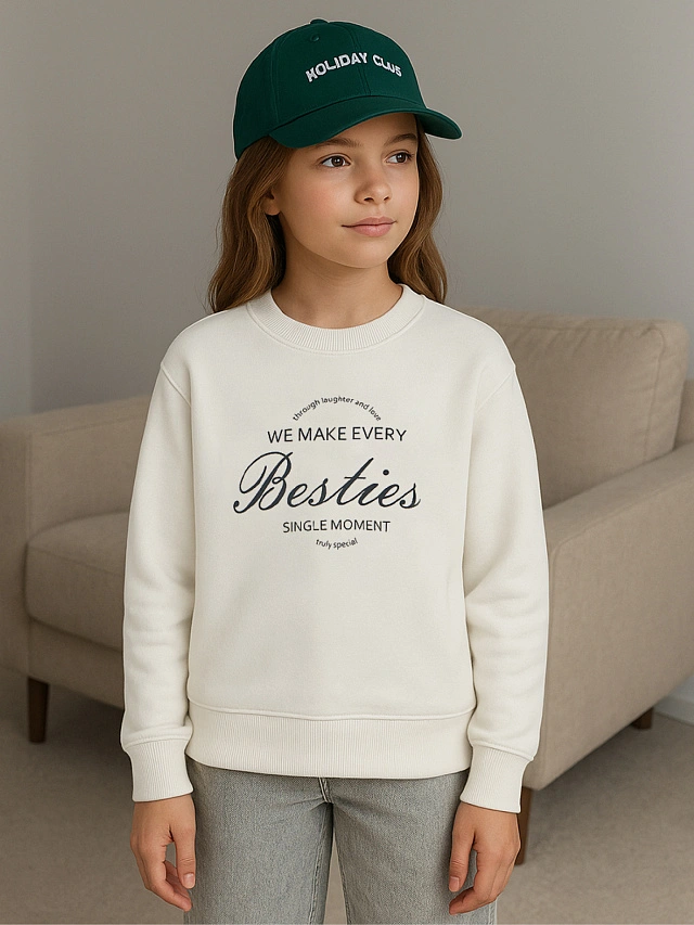 Надпись с добрым посылом подчеркивает ценность дружбы. Состав с преобладанием хлопка обеспечивает воздухообмен, а полиэстер добавляет прочности и устойчивости к деформации. Свитшот подойдет для школы, прогулок или отдыха — в нем юная модница будет чувствовать себя уютно и уверенно. Универсальный бежевый цвет легко сочетается с джинсами, юбками или спортивными брюками.