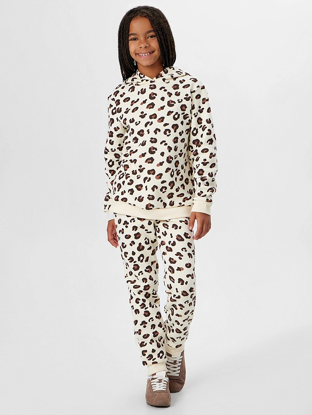 Анорак свободного кроя со спущенными плечами не сковывает движения. Капюшон, манжеты и пояс из эластичной рибаны мягко фиксируются, не давя и не оставляя следов. Брюки прямого силуэта с широкой резинкой и шнурком на поясе легко настроить по фигуре, а манжеты внизу не дают им задираться. Леопардовый принт понравится юным модницам, а нейтральный бежевый цвет сочетается с любой одеждой. Комплект подойдет для прогулок или отдыха. Если вы ищете, где купить детский костюм, который не теряет форму после стирки и дарит радость активным малышкам — это идеальный вариант!