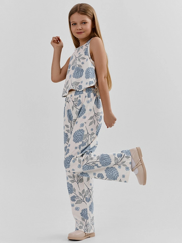 Костюм для девочек с голубыми цветами на молочном фоне — удобное сочетание для тёплых дней. Топ с круглой горловиной и фигурным нижним краем: детали спинки и переда по пройме скреплены внахлёст, что смотрится аккуратно и добавляет модели простой, но интересный штрих. Все края — горловина, проймы и низ — обработаны материалом из той же ткани.