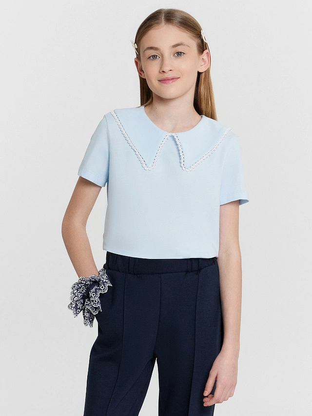 Блузка прямого силуэта. Рукава короткие, втачные. Горловина круглой формы с воротником.