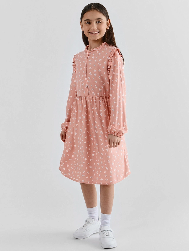 Платье с нежным цветочным принтом — милый и удобный вариант для повседневных образов и праздничных дней. Прямой силуэт с отрезной юбкой по талии создаёт аккуратную линию. Круглая горловина с воздушной рюшей и длинные рукава с «крылышками» добавляют образу лёгкости и игривости. Эластичная тесьма по низу рукавов мягко фиксируется, сохраняя форму.