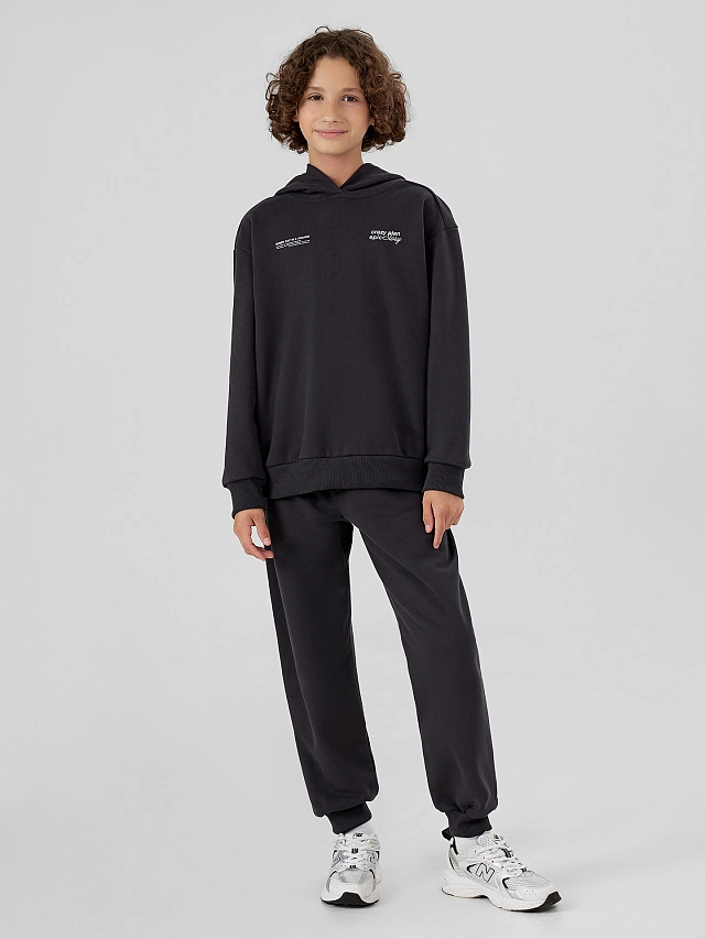Худи свободного силуэта для мальчиков с капюшоном. Горловина округлой формы. Капюшон со средним швом, на подкладке из основного полотна. Плечо спущено, рукав втачной длинный. По низу рукава отрезная манжета из рибаны. Пояс отрезной из рибаны.Брюки для мальчиков. Без бокового шва. Карманы в вытачке. Пояс отрезной с внутренней эластичной тесьмой. Пояс прострочен двумя отделочными строчками. Внутри в пояс втянут шнур. Низ брюк обработан манжетами из рибаны.