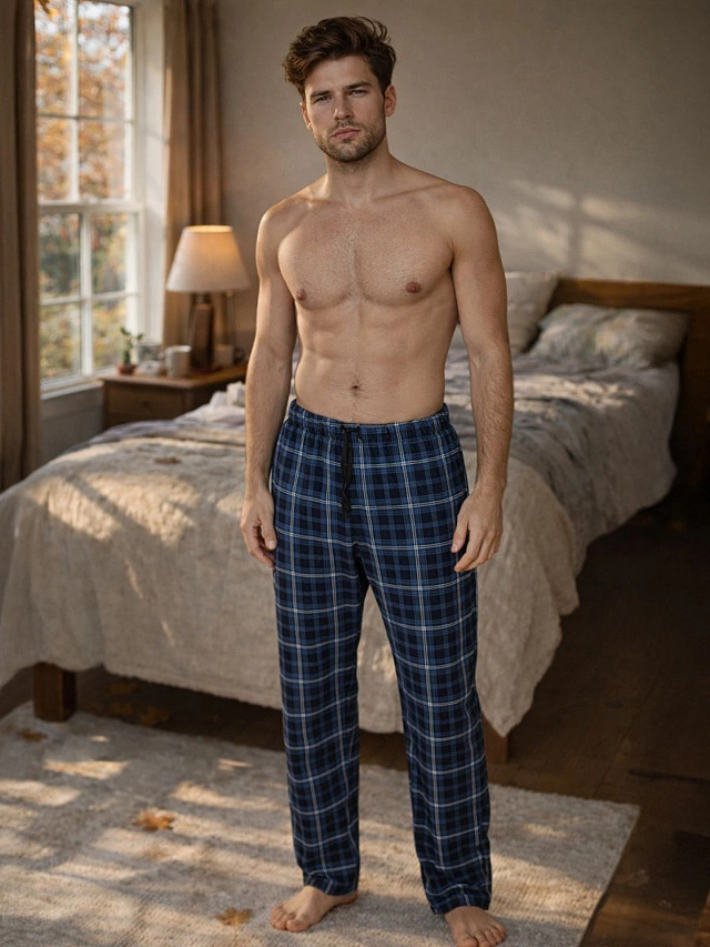 Мужские домашние брюки в синюю клетку — это сочетание практичного стиля и повседневного комфорта. Прямой силуэт и эластичный пояс на кулиске обеспечивают идеальную посадку и свободу движений, позволяя легко регулировать посадку под фигуру.