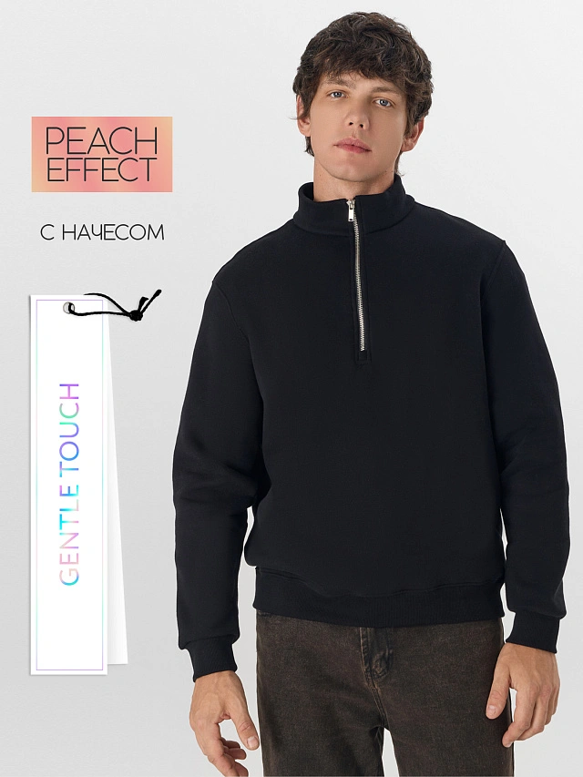 Черный мужской свитшот с застежкой-молнией из коллекции Gentle Touch сочетает удобство классической модели и функциональность толстовки. Модель выполнена из футера с пич-эффектом, создающим бархатистую поверхность для комфорта. Свободный прямой крой со слегка спущенной линией плеча обеспечивает удобную посадку, не стесняющую движений.