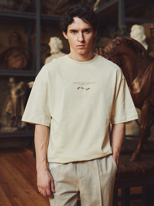 Основой футболки служит стопроцентный хлопок — материал, известный своей природной мягкостью, гипоаллергенностью и отличной воздухопроницаемостью. Особое плетение нитей обеспечивает приятную, структурированную плотность ткани, которая отлично держит форму, не растягиваясь со временем, и дарит комфорт в любую погоду. Модель oversize из мягкого, дышащего хлопка обеспечивает максимальный комфорт и свободу самовыражения.