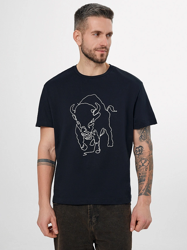 Горловина с отделкой из рибаны и аккуратная обработка всех швов гарантируют удобную посадку и долговечность. Смелый принт с изображением зубра символизирует мощь и уверенность, сохраняя четкость и насыщенность после множества стирок.
