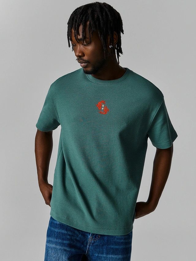 Ткань с вафельной текстурой из стопроцентного хлопка — материал мягкий, хорошо пропускает воздух и приятен к телу. Фактура добавляет объём и делает футболку более интересной на ощупь, при этом ткань остаётся лёгкой и комфортной.