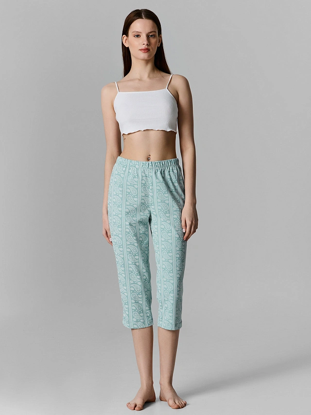 Домашние бриджи в нежном голубом оттенке с восточным узором пейсли — уютный выбор для спокойных домашних дней. Прямой силуэт и длина ниже колена обеспечивают комфорт и свободу движений, а классическая посадка на талии дарит удобство в течение всего дня. Лаконичная модель без карманов выглядит аккуратно и просто.