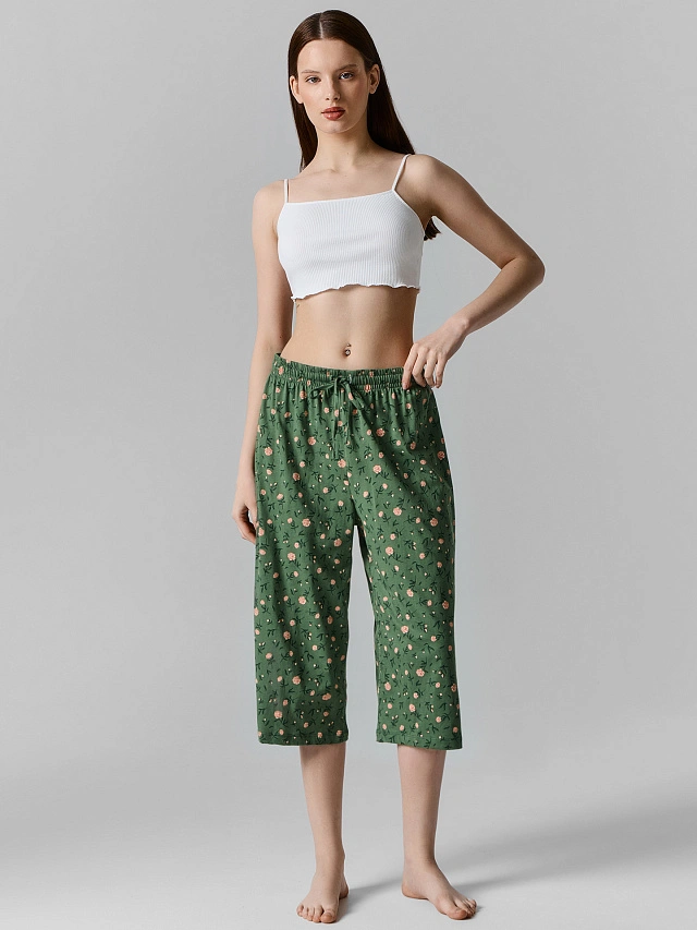 Эти женские домашние бриджи — сочетание комфорта и универсального дизайна! Модель прямого силуэта обеспечивает удобную посадку и свободу движений, позволяя чувствовать себя расслабленно в течение дня. Эластичная талия на кулиске мягко фиксируется, обеспечивая комфортную посадку без давления. Низ изделия застрочен швом в подгибку, что придает аккуратность и долговечность, сохраняя форму даже после частых стирок.
