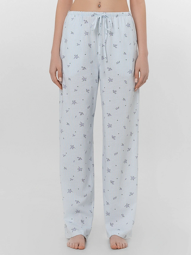 Голубые домашние брюки с цветочным принтом — это уют и свобода в каждой детали. Высокая посадка и свободный силуэт из мягкого хлопкового трикотажа обеспечивают комфорт и полную свободу движений, идеально подходя для отдыха дома.