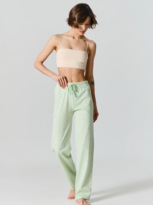Зеленые домашние брюки в полоску — это идеальный выбор для повседневного отдыха. Модель прямого силуэта с эластичным поясом обеспечивает мягкую поддержку и удобную посадку, которая не стесняет движений.
