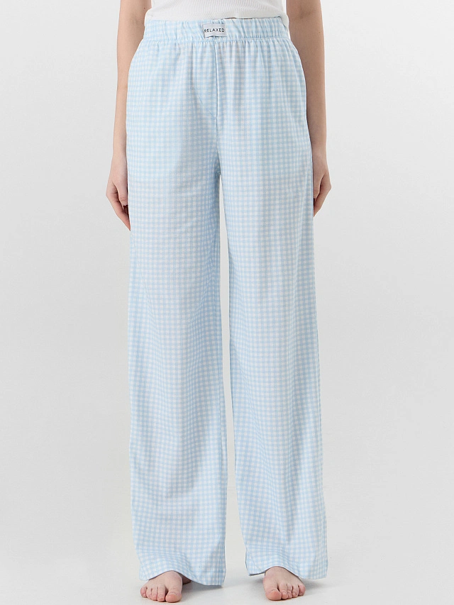 Брюки изготовлены из хлопка. Этот натуральный материал мягкий, дышащий и обеспечивает комфорт в течение всего дня. Классическая клетка на голубом фоне создает спокойный и стильный образ. Эти брюки станут отличным выбором для домашних дел, спокойного вечера или отдыха, сочетаясь с футболками, топами или свитшотами.