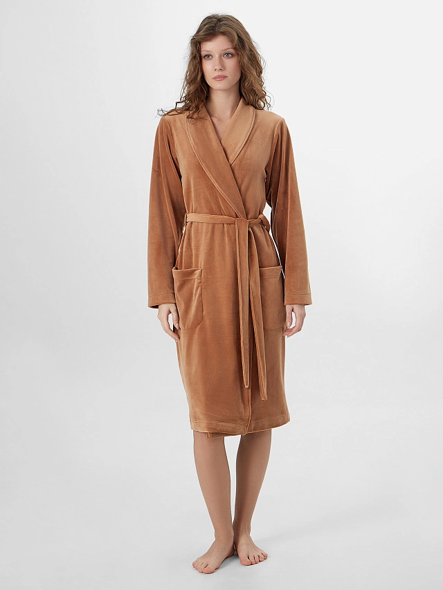 Коричневый велюровый халат для женщин — это уют, который чувствуется с первого прикосновения. Модель длиной до колена с мягким запахом и поясом нежно обволакивает фигуру, создавая ощущение теплой заботы. Длинные рукава и удобные боковые карманы обеспечивают максимальный комфорт во время носки.