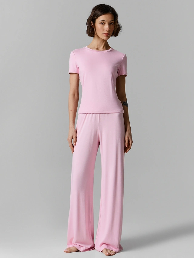 Розовый домашний комплект — мягкий и уютный набор для спокойных дней. В него входят прилегающая футболка с коротким рукавом и прямые свободные брюки. Вместе они создают образ, в котором комфортно отдыхать, заниматься делами или встречать утро выходного дня.
