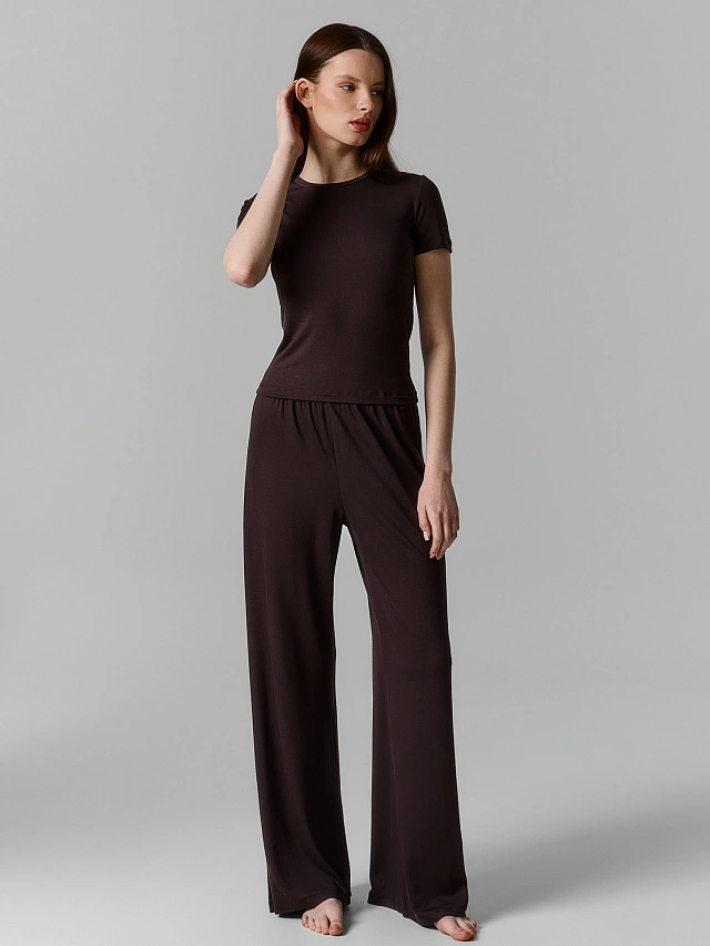 Коричневый домашний комплект — мягкий и уютный набор для спокойных дней. В него входят прилегающая футболка с коротким рукавом и прямые свободные брюки. Вместе они создают образ, в котором комфортно отдыхать, заниматься делами или встречать утро выходного дня.