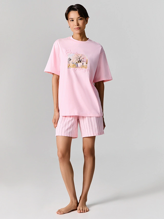 Мягчайшая кулирная гладь из натурального хлопка нежно обволакивает кожу, обеспечивая идеальный микроклимат в любое время года. Материал обладает природной гипоаллергенностью и прекрасной воздухопроницаемостью, оставаясь невероятно приятным на ощупь после множества стирок. Футболка свободного кроя со спущенным плечом дарит ощущение невесомости и полной свободы, а короткие рукава не сковывают движения. Шорты с широким эластичным поясом мягко фиксируются на талии, не оставляя следов и обеспечивая абсолютное удобство в любой позе.