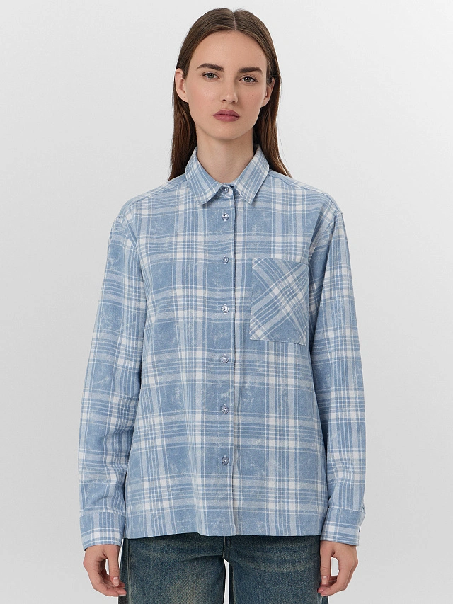 Женская рубашка из хлопка в клетку — базовый элемент гардероба, который сочетает комфорт и классический стиль. Модель прямого силуэта с отложным воротником и длинными рукавами на манжетах создает элегантный образ.