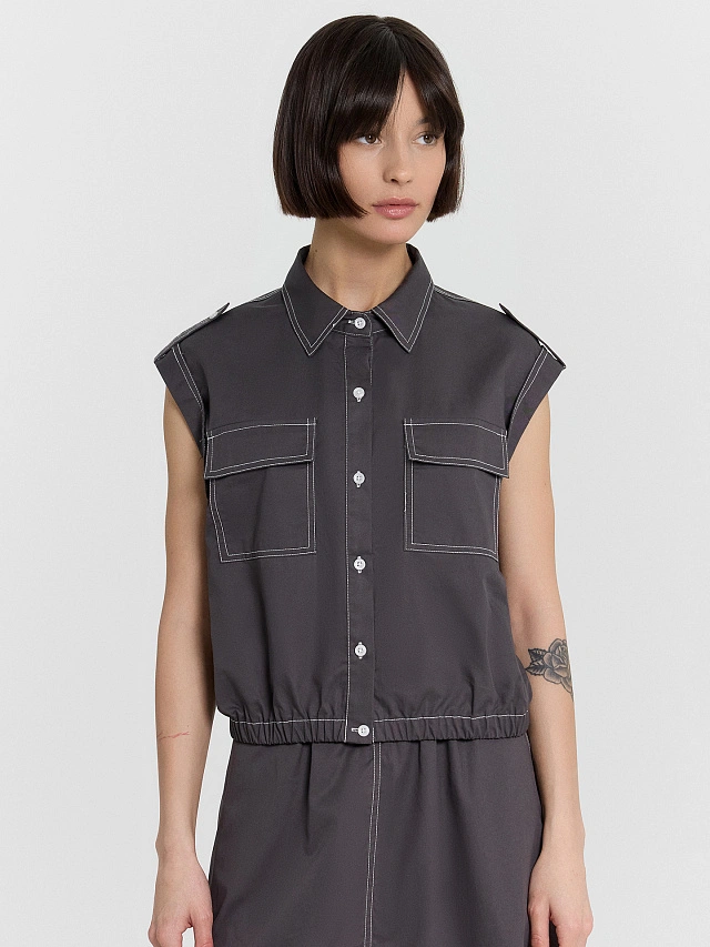 Женская рубашка без рукавов — идеальный выбор для легкого и стильного образа! Прямой крой создает лаконичный силуэт, а отложной воротник придает классический акцент. Застежка на пуговицах по всей длине делает модель универсальной, позволяя регулировать посадку и стиль. Накладные карманы с клапанами на груди добавляют выразительности и функциональности, а эластичная вставка по нижнему краю обеспечивает удобную и комфортную посадку. Выполненная из чистого хлопка, рубашка остается приятной к коже, обеспечивая воздухопроницаемость и свежесть даже в жаркую погоду. Для создания гармоничного комплекта сочетайте ее с подходящей юбкой из этой же коллекции, чтобы подчеркнуть элегантность и индивидуальный стиль.