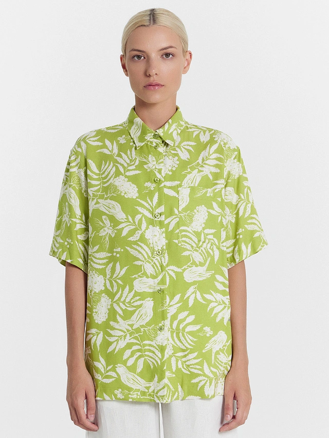 Рубашка женская в зеленом оттенке с птицами
