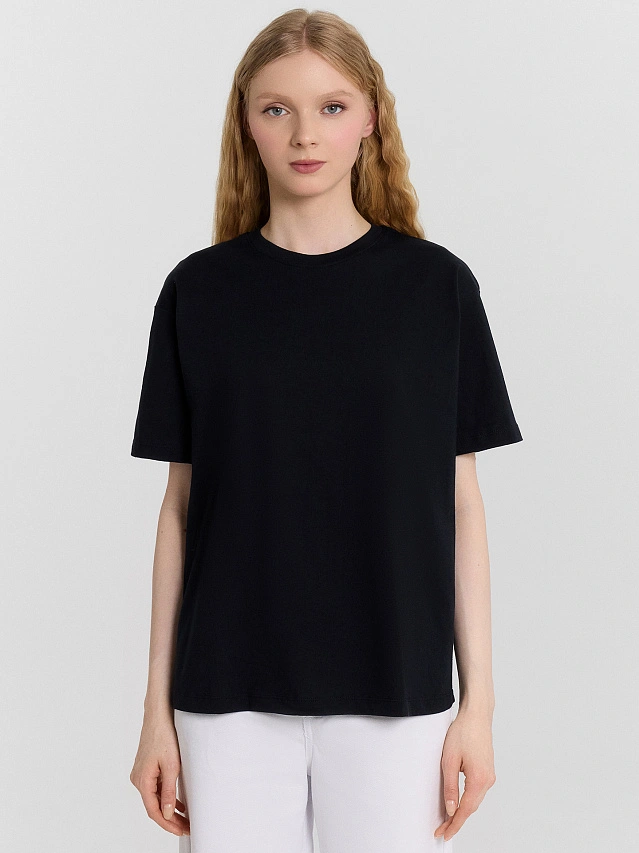 Хлопковая футболка свободного силуэта из трикотажной кулирки. Вырез круглой формы. Свободу движений гарантируют спущенная линия плеча и углубленная пройма. Рукава широкие, чуть выше локтя. Стильная модель!