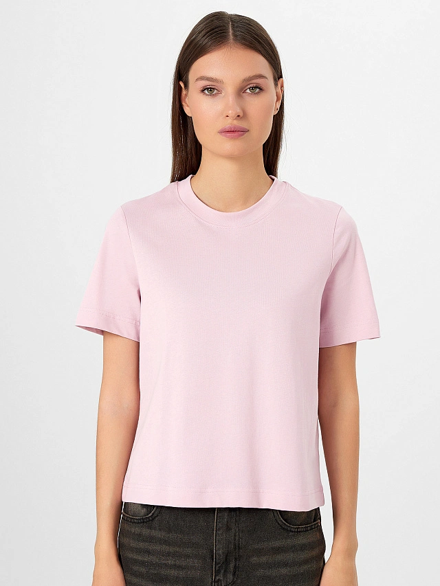 Базовая женская футболка прямого силуэта из трикотажной кулирки — это универсальная модель, которая легко впишется в повседневный гардероб. Слегка укороченная длина придает образу современность и делает футболку актуальной для сочетания с джинсами, брюками или юбками с завышенной талией. Круглая горловина оформлена широкой обтачкой из рибаны, что помогает сохранять форму и подчеркивает аккуратность исполнения. Широкие рукава добавляют расслабленности и комфорта, а широкие подгибки на рукавах и нижнем срезе подчеркивают качество пошива и делают изделие особенно долговечным. Трикотажная кулирка — мягкий, дышащий материал, приятный к телу и устойчивый к деформации, что делает футболку идеальной для ежедневной носки.