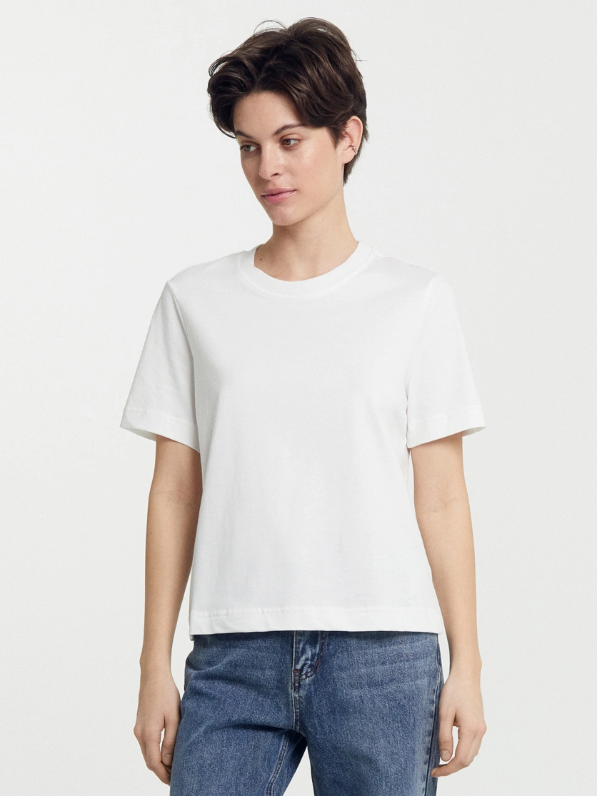 Футболка прямого силуэта из трикотажного полотна кулирка. Горловина круглой формы, широкая обтачка из рибаны.