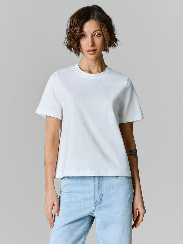 Базовая белая футболка — идеальная основа для любого повседневного образа. Прямой силуэт со слегка укороченной длиной создаёт современный и аккуратный вид, который легко комбинировать с джинсами, брюками или юбкой. Широкая горловина с обтачкой из рибаны сохраняет форму, а свободные рукава добавляют ощущение лёгкости и комфорта.