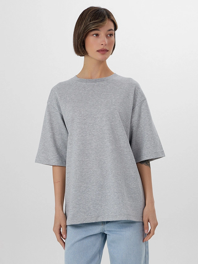 Серая женская футболка свободного силуэта — универсальная основа для стильных повседневных образов. Модель с круглой горловиной и спущенной линией плеча создает расслабленный и современный вид. Футболка выполнена из мягкого интерлока, который сохраняет форму даже после активной носки.