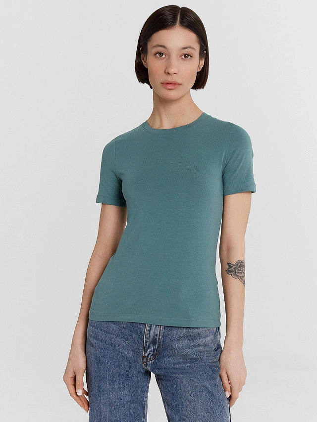 Женская футболка прилегающего силуэта – стильное и комфортное решение для повседневного гардероба. Модель с круглой горловиной и короткими рукавами идеально подчёркивает фигуру, придавая изящность и элегантность. Нижние срезы футболки и рукавов аккуратно обработаны швом вподгибку, что обеспечивает долговечность и аккуратный вид. Изготовленная из мягкой и приятной кулирки, эта модель дарит комфорт и удобство в течение всего дня. Прекрасно сочетается с различными элементами гардероба, позволяя создавать разнообразные и стильные образы.