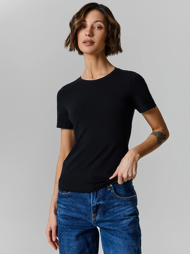 Женская футболка прилегающего силуэта — базовая модель, которая должна быть в каждом гардеробе. С круглой горловиной и короткими рукавами, она идеально подходит для любого случая, обеспечивая стиль и комфорт. Для выполнения этой модели использовали кулирку — мягкий и легкий трикотажный материал, отличающийся своей гладкой поверхностью и отличной воздухопроницаемостью. Такая ткань приятна к телу, хорошо держит форму и не теряет цвет даже после многочисленных стирок, обеспечивая долговечность изделия.