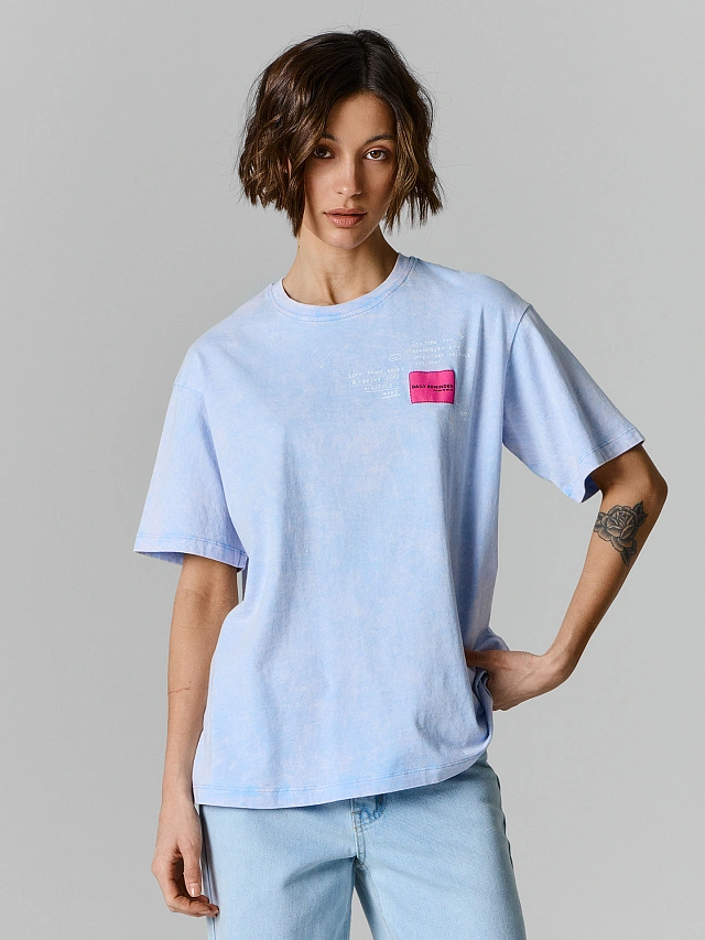 Футболка в нежном голубом оттенке с эффектом acid wash — мягкого винтажного состаривания, создающего лёгкие, неравномерные разводы и потёртости — станет особенным и продуманным подарком на 14 февраля.