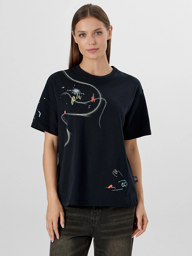 Свободный крой с круглым вырезом и спущенными плечами обеспечивает полную свободу движений. Футболка станет стильной основой повседневного гардероба, легко сочетаясь с джинсами, юбками, брюками или шортами. Надежная конструкция швов и качество материала гарантируют, что футболка сохранит безупречный вид при ежедневной носке.