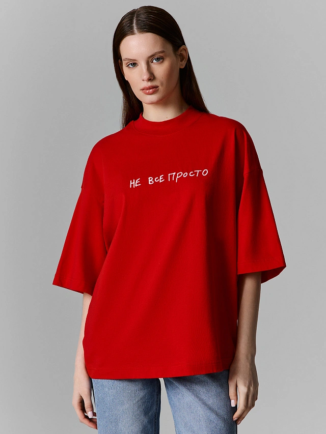 Женская футболка свободного кроя с вышивкой «Не всё просто/ Не, все просто» — это лаконичная и стильная модель для повседневной носки. Её силуэт с круглой горловиной, спущенным плечом и широкими рукавами выше локтя обеспечивает комфортную посадку и свободу движений.