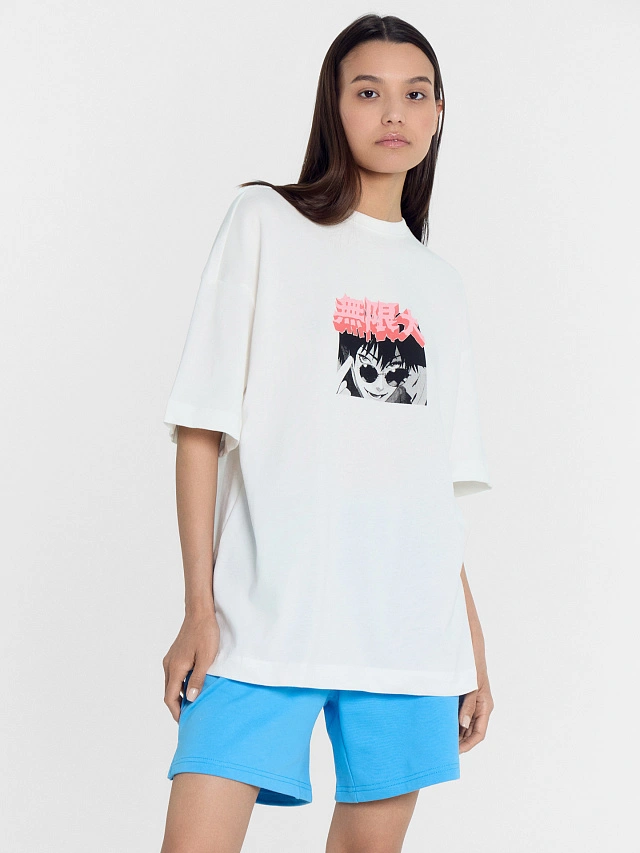 Коллекционная женская футболка с дизайнерским принтом в виде аниме. Модель свободного силуэта, с углубленной проймой и рукавами выше локтя. Изготовленная из высококачественного хлопка, она обеспечит максимальный комфорт на протяжении всего дня. Натуральные материалы позволяют коже дышать, создавая ощущение свежести и прохлады, даже в самую жаркую погоду. Оверсайз силуэт дарит непревзойденную свободу движений. Широкий размерный ряд. Отличный подарок для себя и близких!