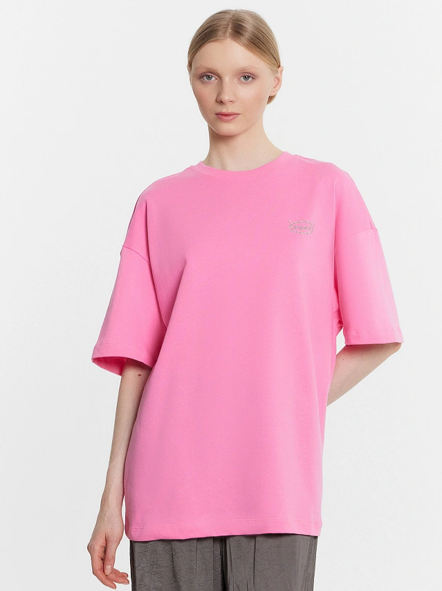 Женская футболка силуэта оверсайз выполнена из кулирки, что обеспечивает комфорт и легкость при носке. Модель имеет круглую горловину и спущенное плечо, создавая стильный и непринужденный образ. Пройма углублена, что добавляет дополнительного комфорта. Широкий рукав длиной чуть выше локтя и удлиненный силуэт придают футболке современный и модный вид. Эта модель идеально подходит для создания повседневных образов, легко сочетается с различными элементами гардероба и добавляет стильности и комфорта в повседневную одежду.