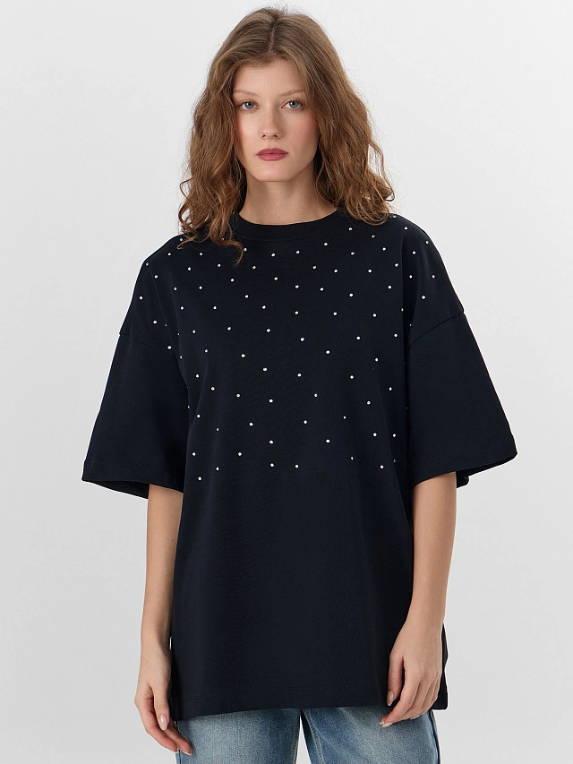 Черная футболка оверсайз с сияющими стразами — идеальная основа для создания нарядного вечернего образа. Свободный крой со спущенной линией плеча и удлиненной спинкой создает элегантный силуэт. Широкие рукава, заканчивающиеся чуть выше локтя, и углубленная пройма обеспечивают максимальный комфорт и свободу движений.