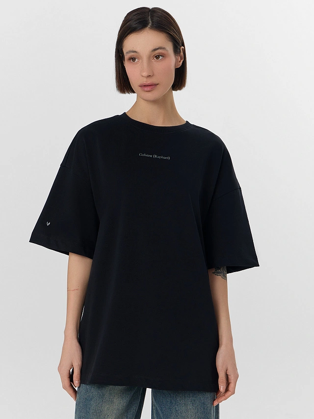 Свободный оверсайз крой со спущенным плечом, углубленной проймой и широкими укороченными рукавами создаёт расслабленный и современный силуэт. Изысканный художественный принт и подробная надпись делают футболку не просто предметом одежды, а выразительным акцентом, подчеркивающим индивидуальность.