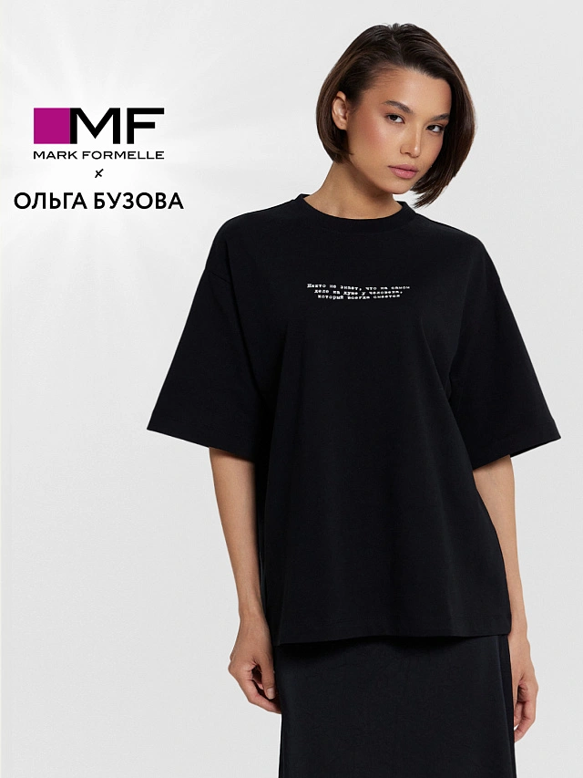 Футболка Mark Formelle x Ольга Бузова черная с надписью ""Никто не знает, что на самом деле на душе у человека, который всегда смеется"