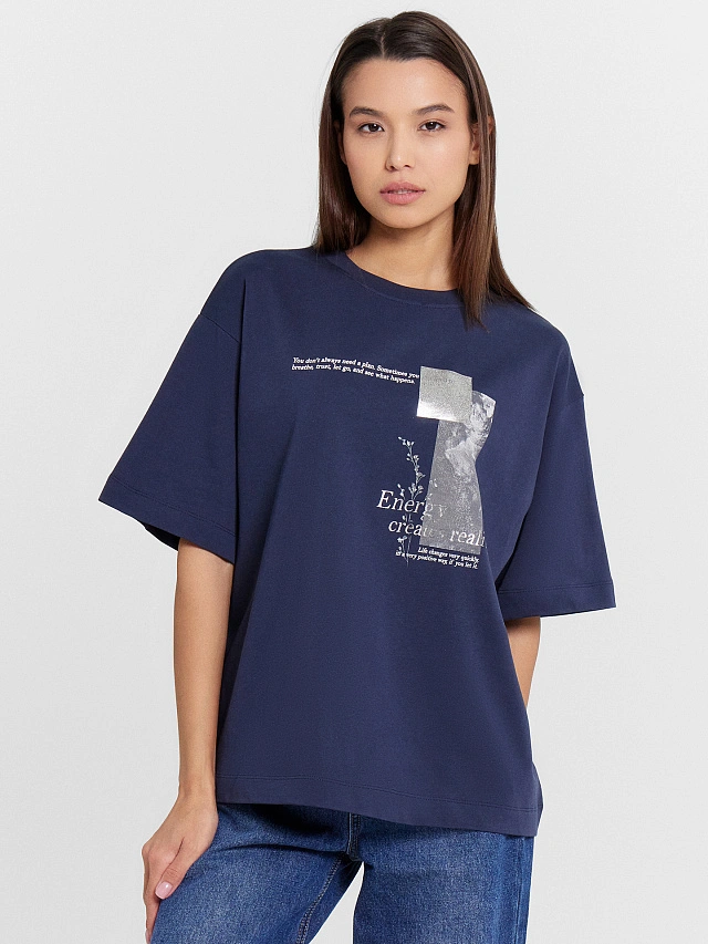 Футболка женская синяя с принтом "Energy creates reality"