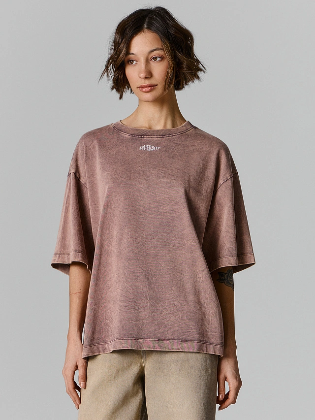 Эта футболка в насыщенном бордовом оттенке с эффектом acid wash — выбор для тех, кто ценит выразительные детали и глубину цвета. Мягкие, неравномерные разводы делают цвет глубоким и живым. Надпись «Diversity» переводится как «Разнообразие».
