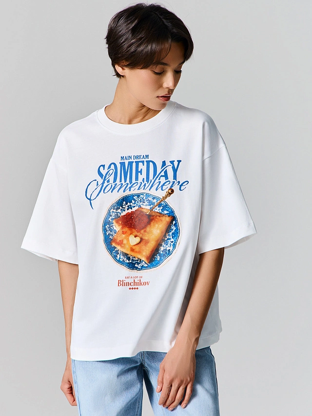 Белая женская футболка оверсайз с праздничным принтом блинчиков с икрой и надписью «Главная мечта: когда-нибудь где-нибудь съесть много блинчиков» станет ярким атрибутом для масленичной недели. Свободный крой со спущенной линией плеча, короткими рукавами и круглой горловиной с отделкой из рибаны обеспечивает удобную посадку и свободу движений.