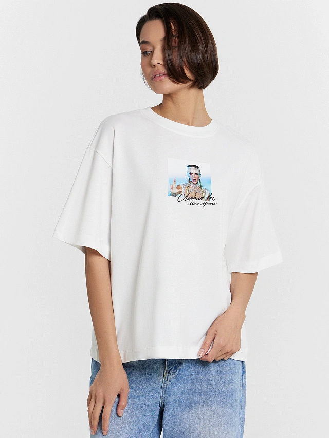 Примеряла с "птушкамi". По размеру ок, лёгкий оверсайз. Отказ так как не понравилась ткань. Хоть и написано на этикетке, что 100% хлопок, но когда держишь в руках, ощущение что есть синтетика в составе - ткань гладкая и немного скользит. Если смять (сжать), то сминается слабо. Я не специалист по хлопковым тканям, но смутила именно ткань.