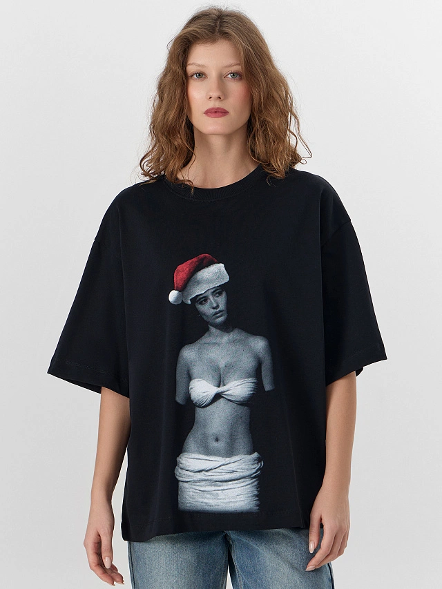 Черная футболка с новогодним принтом — идеальный выбор для создания праздничного настроения. Свободный оверсайз крой и спущенная линия плеча позволяют футболке мягко скользить по фигуре, не обтягивая ее, что дарит полную свободу движений. Короткие рукава и круглая горловина с отделкой из рибаны сохраняют мягкое, ненавязчивое касание к коже, обеспечивая удобство без давления.